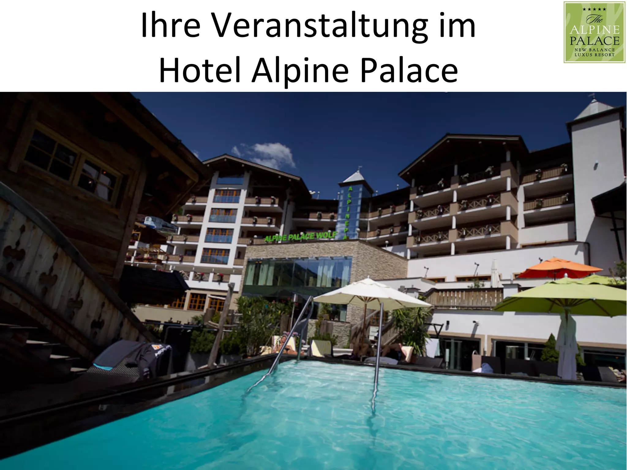 Das Dokument beschreibt eine Veranstaltungsortbeschreibung für das Hotel Alpine Palace, das ein Business Center und verschiedene Eventmöglichkeiten wie Hochzeiten, Präsentationen und Pokerturniere bietet. Es wird auf die Veranstaltungsfläche von 1.000 m2 und die private Wolf’s Hütte verwiesen. Interessierte können sich an die Eventmanagerin Sylvia Steger oder die Rezeption wenden, um weitere Informationen zu erhalten.