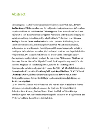 Die Masterarbeit untersucht Alternate Reality Games (ARGs) als neuartige Form des Geschichtenerzählens, die reale und fiktionale Elemente integriert und soziale Interaktionen fördert. Sie beleuchtet die Entwicklung dieser Spiele, deren Definition, verschiedene Einsatzmöglichkeiten sowie ethische Fragestellungen und endet mit einem Ausblick auf zukünftige Entwicklungen unter Berücksichtigung technologischer Einflüsse. ARGs sind mehr als nur Marketinginstrumente; sie eröffnen neue Wege des spielerischen Lernens und der kollaborativen Problemlösung.