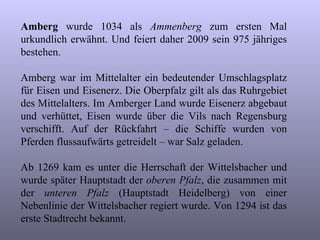 Im Jahr 2009 feiert die Stadt Amberg ihr 975-jähriges Bestehen, nachdem sie 1034 urkundlich erwähnt wurde. Im Mittelalter war Amberg ein bedeutender Umschlagplatz für Eisen und Eisenerz, und die Stadt hat eine gut erhaltene Stadtmauer sowie historische Bauwerke wie die Basilika St. Martin und die Kirche Mariahilfkirche. Ein Rundgang durch die Altstadt zeigt die kulturellen und historischen Schätze, die die Stadt geprägt haben.