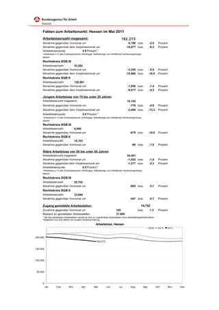 Im Mai 2011 betrug die Arbeitslosenzahl in Hessen 182,273, was einem Rückgang von 2,8 Prozent im Vergleich zum Vormonat und 8,5 Prozent im Vergleich zum Vorjahresmonat entspricht. Die Arbeitslosenquote liegt bei 5,8 Prozent, wobei insbesondere die Zahl der jüngeren Arbeitslosen sowie der älteren Arbeitslosen abnahm. Die Zahl gemeldeter Arbeitsstellen stieg im Vergleich zum Vormonat um 1,3 Prozent auf 37,869.
