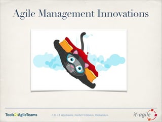 Das Dokument beschreibt agiles Management und die Schlüsselfaktoren, die langfristig erfolgreiche Unternehmen ausmachen, wie kreative Lösungen und die Zusammenarbeit mit Kunden. Es betont die Bedeutung von individuell motivierten Teams, flexibler Reaktion auf Veränderungen und der Schaffung einer unterstützenden Arbeitsumgebung. Zudem werden Konzepte wie Soziokratie, Peer-Feedback und innovative Entscheidungsprozesse hervorgehoben.