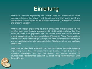 Ammonite Corrosion Engineering Inc. bietet umfassende Dienstleistungen im Bereich Korrosionsmanagement und -schutz für die Öl- und Gasindustrie seit 1998. Das Unternehmen beschäftigt über 300 Jahre Erfahrung in Ingenieurtechnik und arbeitet eng mit Cormetrics Ltd. zusammen, um unseren Kunden umfassende Lösungen, Schulungen und Beratungen anzubieten. Die Firma fokussiert sich auf die Verbesserung der Sicherheit und Zuverlässigkeit von Anlagen und Rohleitungen sowie die Unterstützung von Ingenieuren im Korrosionswesen.