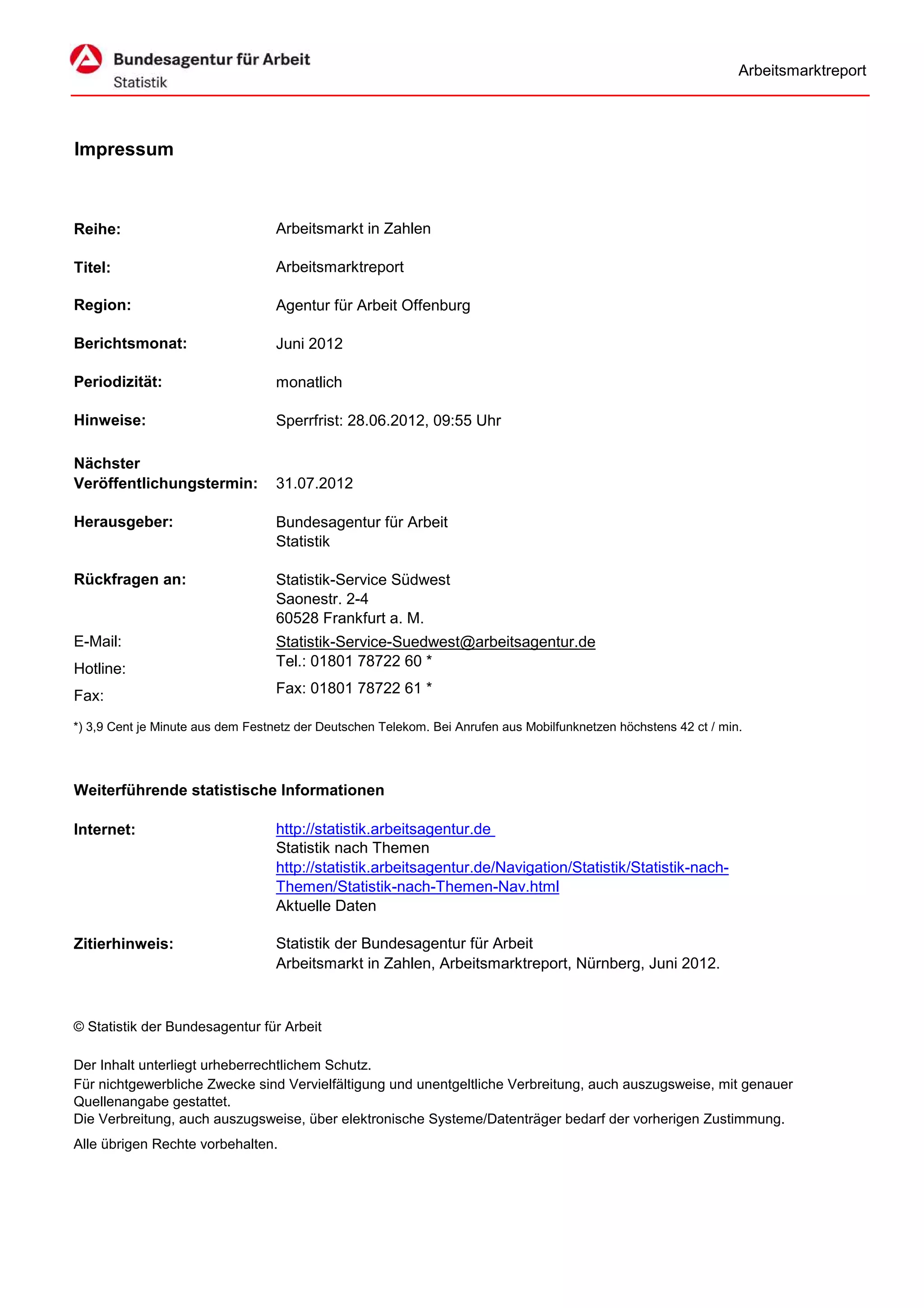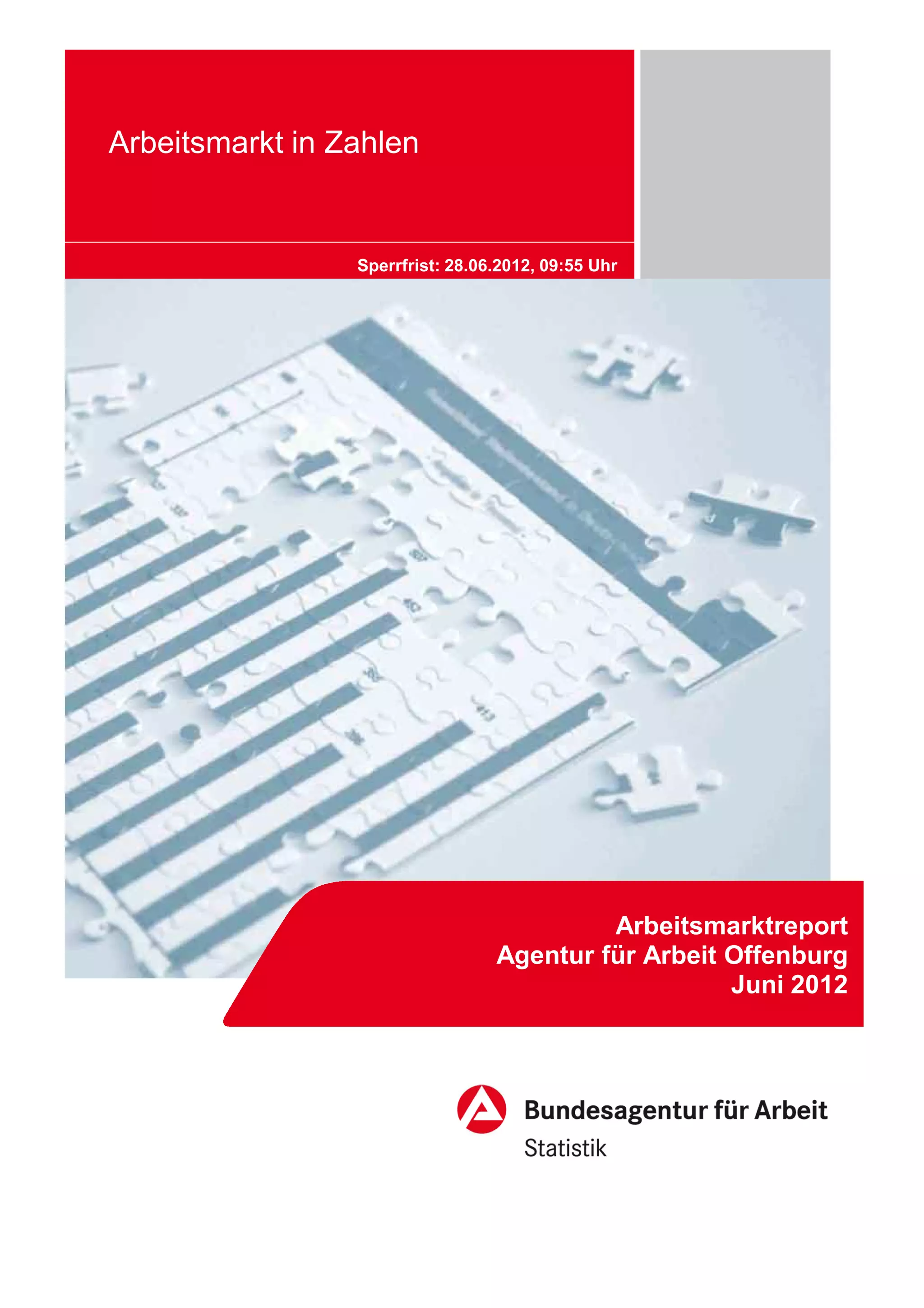 Der Arbeitsmarktreport der Agentur für Arbeit Offenburg für Juni 2012 zeigt, dass die Anzahl der arbeitslosen Personen im Vergleich zum Mai um 1,1 % gesunken ist, dennoch eine Steigerung im Jahresvergleich verzeichnet werden kann. Neuorganisationen der Jobcenter führten zu Datenanpassungen und potenzieller Untererfassung in bestimmten Regionen. Die Arbeitslosenquote liegt bei 3,4 % und es sind signifikante Veränderungen in den Zugangszahlen von Arbeitslosen zu verzeichnen.