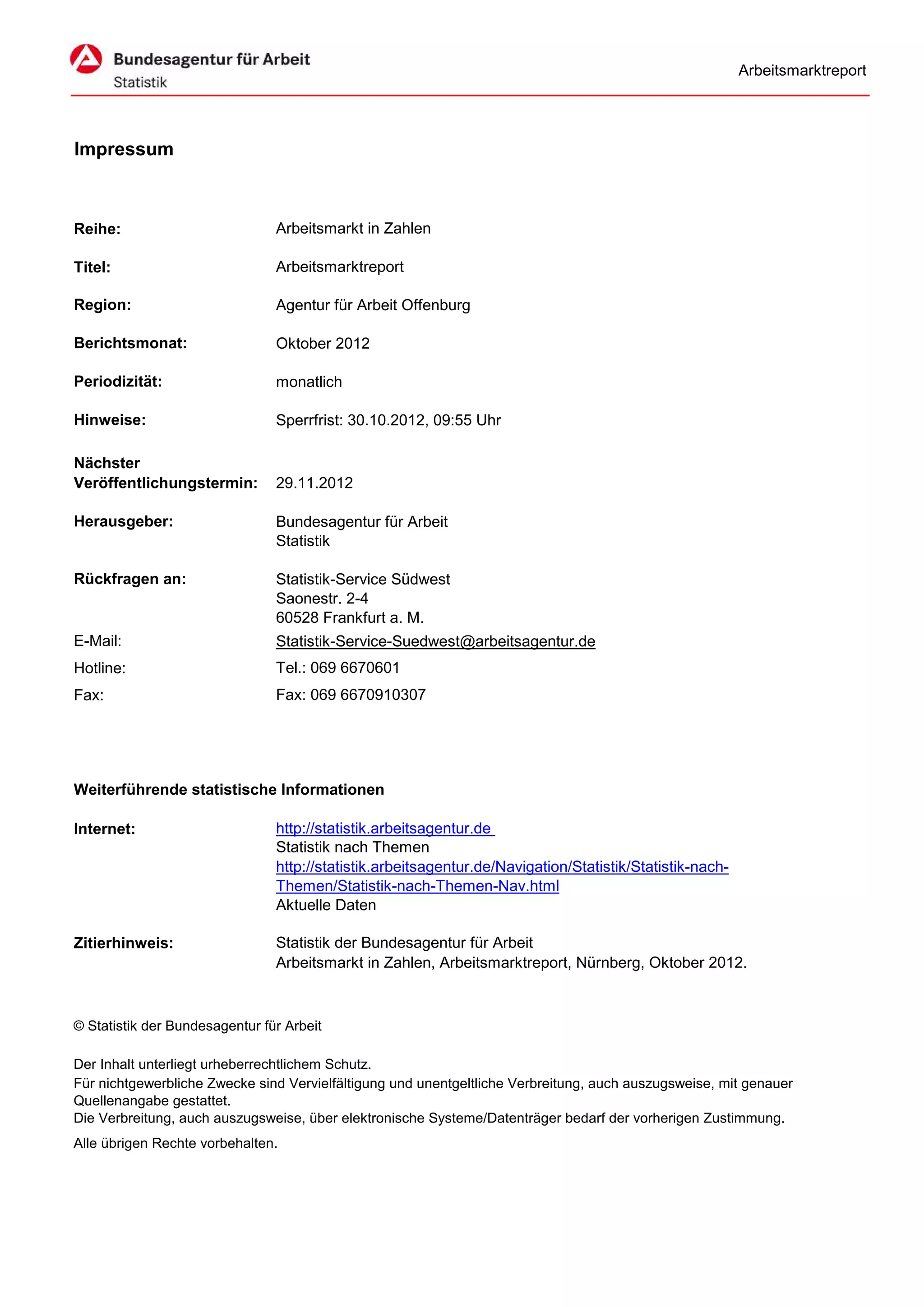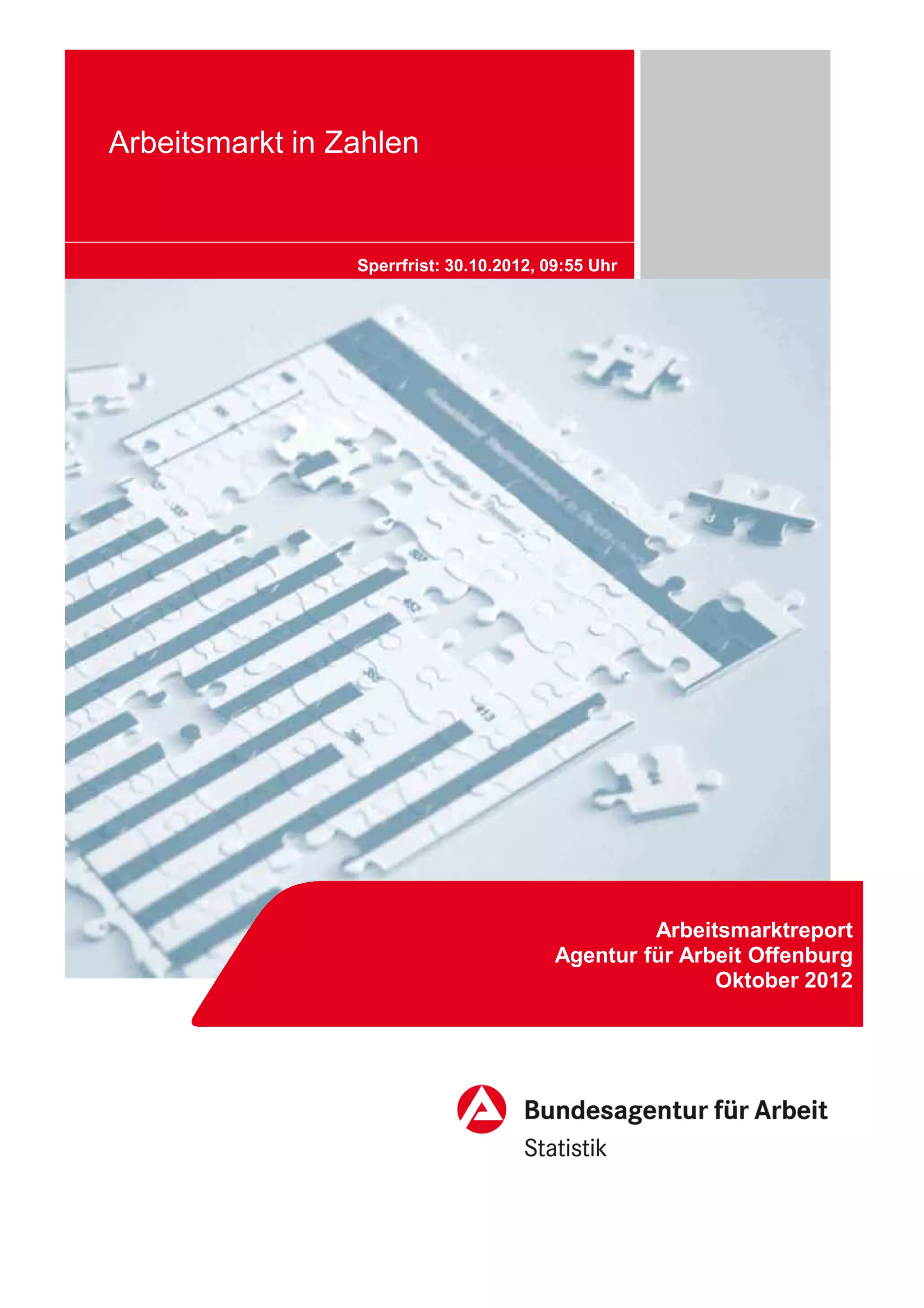 Der Arbeitsmarktreport der Agentur für Arbeit Offenburg für Oktober 2012 dokumentiert einen leichten Rückgang der Arbeitslosigkeit im Vergleich zum Vorjahr. Es wurden 8.202 Arbeitslose gezählt, was einer Quote von 3,5 % entspricht, wobei Männer und Frauen fast gleichverteilt sind. Der Bericht enthält zudem wichtige Statistiken zur Beschäftigung und Arbeitsuchenden in der Region sowie Hinweise auf methodische Änderungen in der Datenberichterstattung.