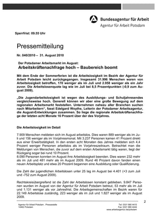 Im August 2010 ist die Arbeitslosigkeit im Potsdamer Bezirk leicht um 0,5% auf 31.996 gesunken, während die Arbeitslosenquote stabil bei 8,5% blieb. Die Nachfrage nach Arbeitskräften, insbesondere im Bau- und verarbeitenden Gewerbe, ist um 16% im Vergleich zum Vorjahr gestiegen, was zu einer Erhöhung der offenen Stellen beiträgt. Trotz der hohen Jugendarbeitslosigkeit aufgrund von Ausbildungsabschluss fanden 46% der arbeitslosen Menschen im August eine neue Anstellung oder begannen eine Ausbildung.