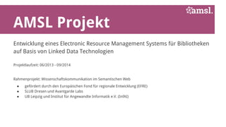 Das AMaSL-Projekt entwickelt ein Electronic Resource Management System für Bibliotheken unter Verwendung von Linked Data-Technologien, gefördert durch den EFRE und in Zusammenarbeit mit mehreren Institutionen. Die Projektarbeit umfasst Anforderungen, Datenmodellierung und Softwareentwicklung sowie die Implementierung einer Vielzahl von OntoWiki-Erweiterungen, die zur Datenintegration und -verwaltung dienen. Die Systembibliothekarische Wartung ermöglicht Anpassungen und die Integration von verschiedenen Knowledge Bases sowie die Durchführung von Echtzeitabfragen.