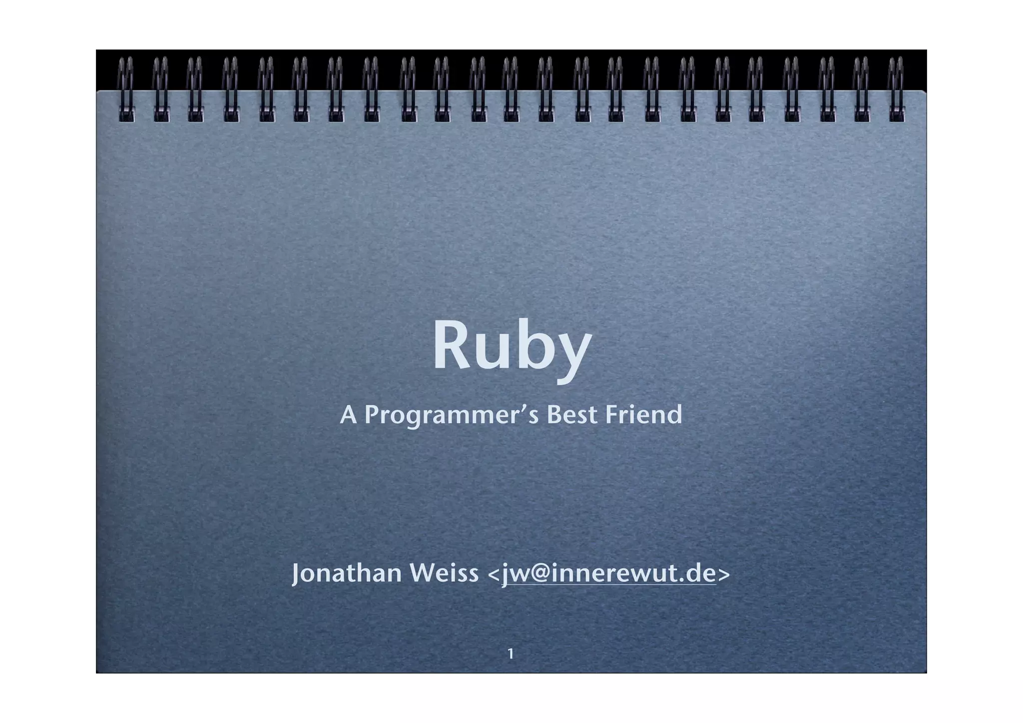 Das Dokument bietet einen umfassenden Überblick über die Programmiersprache Ruby, einschließlich ihrer Eigenschaften, Installation, grundlegenden Syntaxregeln und Programmierkonzepte wie Objekte, Klassen, Vererbung und Methoden. Es wird auch auf die Funktionalität von Ruby on Rails, das MVC-Architekturmodell sowie zahlreiche Ressourcen für Entwickler eingegangen. Abschließend werden Hilfswerkzeuge und Bibliotheken vorgestellt, die den Entwicklungsprozess unterstützen.