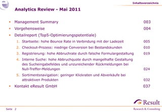 Die Analytics Review von Mai 2011 identifiziert fünf Hauptoptimierungspotenziale für die Website, darunter die Reduzierung der Bounce Rate durch Ladezeitenoptimierung, Verbesserung des Checkout-Prozesses, und Vereinfachung der Registrierung. Es wird empfohlen, klarere Feedbackmechanismen und eine bessere Gestaltung der Suchfunktion zu implementieren, um die Nutzungsfreundlichkeit zu erhöhen. Diese Maßnahmen sollen die Conversion-Rate steigern und die Abbruchraten reduzieren.
