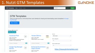 Das Dokument bietet 40 Tipps und Impulse zur Nutzung von Google Tag Manager und Google Analytics, darunter die Verwendung von GTM-Vorlagen, die Messung von Engagement und Strategien zur Vermeidung von doppelten Transaktionen. Es enthält Links zu praktischen Ressourcen und zeigt, wie man Datenanalyse optimiert und Datenschutz berücksichtigt. Die aufgeführten Strategien sind hilfreich für Webmaster und Marketing-Profis, um das Nutzerverhalten besser zu verstehen und das Tracking zu verbessern.