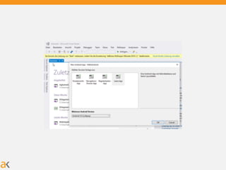 Das Dokument behandelt die Entwicklung von Android Apps mit Xamarin, einschließlich der Herausforderungen, die bei der Erstellung von mobilen Anwendungen auf verschiedenen Plattformen auftreten. Es werden sowohl native als auch hybride Entwicklungsansätze diskutiert, wobei die Xamarin-Plattform und ihre Integration in Visual Studio hervorgehoben werden. Darüber hinaus bietet das Dokument Einblicke in spezifische Android-Konzepte, Datenhaltung und die Verwendung von Intents in Apps.