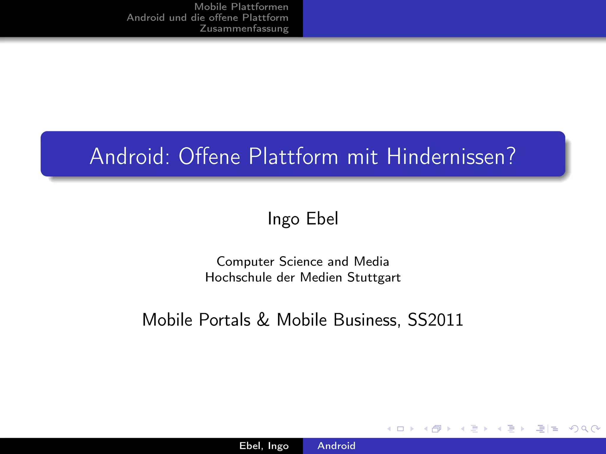 Das Dokument behandelt die mobile Plattform Android und ihre Eigenschaften als offene Plattform mit sowohl Vorteilen als auch Problemen. Es wird festgestellt, dass Android zwar von der Open Handset Alliance entwickelt wurde und großen Freiraum für Hersteller bietet, jedoch Google die Kontrolle behält und es signifikante Herausforderungen wie Fragmentierung und Sicherheitsbedenken gibt. Die Zukunft von Android als führende Smartphone-Plattform wird diskutiert, wobei ein Anstieg von Viren und Schadsoftware prognostiziert wird.