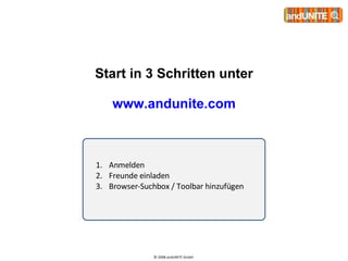 Das Dokument beschreibt, wie man die Andunite-Plattform in drei einfachen Schritten nutzen kann: Anmeldung, Freunde einladen und eine Suchbox oder Toolbar hinzufügen. Nutzer können Suchbegriffe eingeben, Ergebnisse sehen und ihre Suchanfragen mit Freunden teilen. Es wird auch betont, dass die Privatsphäre der Nutzer gewahrt bleibt, indem sie auswählen können, wer ihre Suchbegriffe sehen kann.