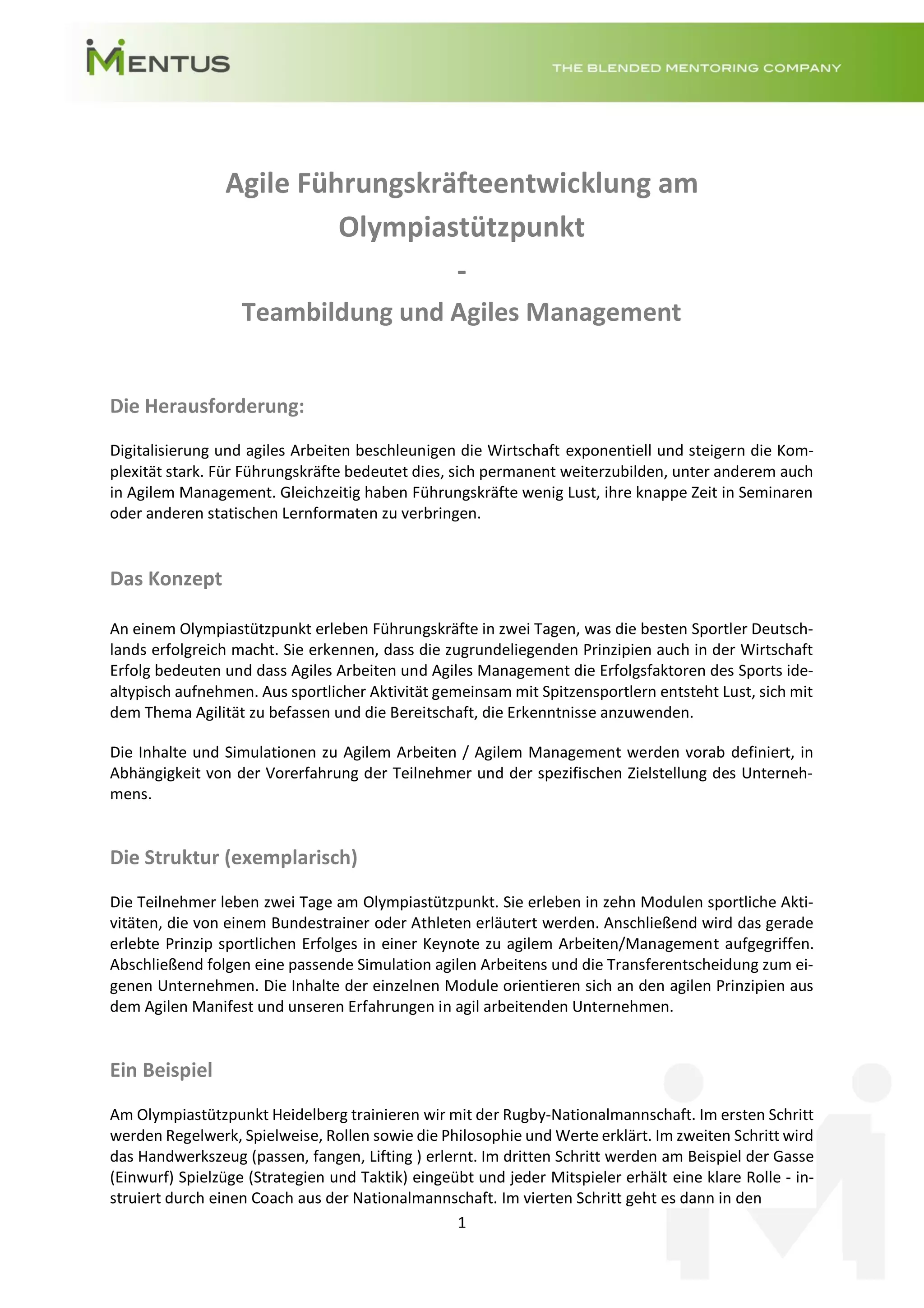 Das Dokument beschreibt ein Konzept zur agilen Führungskräfteentwicklung am Olympiastützpunkt, das darauf abzielt, Führungskräften durch sportliche Aktivitäten und direkte Interaktionen mit Spitzensportlern agile Prinzipien näherzubringen. Die Teilnehmer erleben sportliche Herausforderungen, die agile Managementstrategien widerspiegeln, und lernen, diese Erkenntnisse in ihren Unternehmen anzuwenden. Ergänzende Angebote reichen von Leadership-Workshops bis hin zu Gesundheitschecks, um die Weiterbildung der Führungskräfte umfassend zu unterstützen.