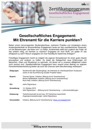 Das Dokument behandelt die Bedeutung von ehrenamtlichem Engagement für Studierende in Bezug auf Karrierechancen und persönliche Entwicklung. Es werden verschiedene Seminare und Projekte vorgestellt, die sich mit Themen wie sozialem Unternehmertum, Öffentlichkeitsarbeit für Non-Profit-Organisationen und Service Learning beschäftigen, wobei die Zielgruppe dabei Studierende aller Fachrichtungen sind. Die Initiative ‚Bildung durch Verantwortung‘ bietet diese Programme an, um interdisziplinären Austausch und praktische Erfahrungen zu fördern.