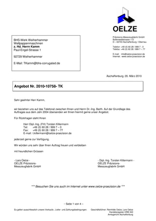 Das Dokument ist ein Angebot der Oelze Präzisions-Messzeugfabrik GmbH für eine Messtechniklösung, die eine Hartgesteinplatte sowie präzise Antriebssysteme umfasst. Der Gesamtpreis beträgt 122.000 Euro netto mit einer Lieferzeit von 6 Monaten nach Klärung aller technischen Details. Es wurden technische Spezifikationen und Zahlungsbedingungen aufgeführt, einschließlich einer Vorabnahme und Einweisung des Kundenpersonals.