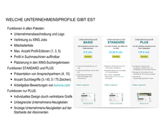 Das Dokument bietet einen Überblick über die Erstellung und Anpassung von Unternehmensprofilen auf Xing, einschließlich der erforderlichen Firmendaten, Kontaktmöglichkeiten und verfügt über Funktionen wie Mitarbeiterlisten und Arbeitgeberbewertungen. Es beschreibt die Schritte zur Profilanlage, einschließlich der Auswahl eines Unternehmens, der Eingabe von Unternehmensinformationen und der Möglichkeit zur Anpassung des Profils. Zudem werden verschiedene Paketoptionen und deren Funktionen erläutert, um die Sichtbarkeit und Präsenz des Unternehmens auf der Plattform zu erhöhen.