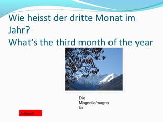 Das Dokument umfasst Fragen und Antworten zu den Monaten des Jahres auf Deutsch und Englisch. Es werden sowohl die Namen der Monate als auch spezielle Ereignisse in bestimmten Monaten erwähnt, wie den Schweizer Nationalfeiertag im August und Weihnachten im Dezember. Zusätzlich gibt es Fragen zu spezifischen Eigenschaften der Monate, wie den ersten Monat oder Monate, die mit bestimmten Buchstaben beginnen.