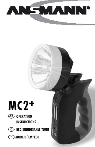 Die mc2+ ist ein wiederaufladbarer Akku-Handscheinwerfer mit einer Leuchtdauer von ca. 160 Minuten, betrieben von einem 4,8V NiMH-Akkupack und mit der Möglichkeit, über ein 230V-Netzteil oder einen 12V DC-Adapter geladen zu werden. Der Handscheinwerfer verfügt über einen schwenkbaren Kopf, eine Blink- und Notlichtfunktion und kann dank eines integrierten Magneten an metallischen Oberflächen befestigt werden. Zubehör wie Wandhalterung, orangefarbene Leuchtblende und Ladeadapter sind im Lieferumfang enthalten, wobei auf die Umweltfreundlichkeit bei der Entsorgung von Akkus hingewiesen wird.