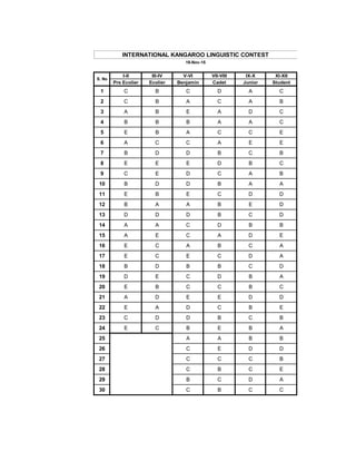 Das Dokument enthält die Ergebnisse des International Kangaroo Linguistic Contest vom 19. November 2015, in dem verschiedene Schüler in mehreren Kategorien getestet wurden. Die Punkte der Teilnehmer sind in tabellarischer Form aufgeführt und zeigen die erbrachten Leistungen. Es umfasst die Ergebnisse von verschiedenen Altersgruppen, einschließlich Ecologist, Benjamins und Cadet.
