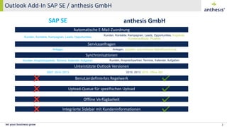 Das Dokument beschreibt das Anthesis Outlook Add-In für SAP Business ByDesign, das die automatische E-Mail-Zuordnung und Synchronisation von Kundeninformationen, Terminen und Aufgaben ermöglicht. Es bietet Funktionen wie eine übersichtliche Sidebar, manuelle Verknüpfungen und eine Upload-Queue für E-Mails sowie die Integrationsmöglichkeiten zur Generierung und Aktualisierung von Service-Tickets direkt aus Outlook. Das Add-In unterstützt verschiedene Outlook-Versionen, erfordert eine Windows-Installation und ist für alle Branchen geeignet, die SAP Business ByDesign nutzen.
