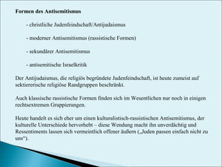 Das Dokument beschäftigt sich mit verschiedenen Formen des Antisemitismus, darunter christliche Judenfeindschaft, moderner rassistischer Antisemitismus und sekundärer Antisemitismus, wobei letzterer insbesondere durch kulturelle Differenzen geprägt ist. Es wird aufgezeigt, dass Rechtsextremismus die Hauptquelle antisemitischer Gewalttaten darstellt, während auch in Teilen der Linken und bei Menschen mit Migrationshintergrund antisemitische Diskurse gefördert werden können. Eine Analyse von politischen motivierten Straftaten (PMK) zeigt, dass rechtsextreme Gruppen weiterhin die bedeutendsten Träger des Antisemitismus in Deutschland sind.