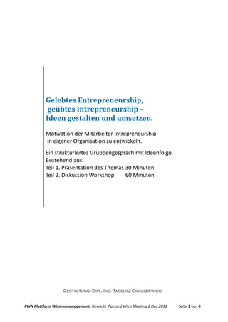 Das Dokument behandelt die Konzepte von gelebtem Entrepreneurship und geübtem Intrapreneurship sowie deren Bedeutung für die Organisationsentwicklung in einer Wissensgesellschaft. Es wird betont, dass individuelle Verantwortung, Teamarbeit und eine unterstützende Unternehmenskultur entscheidend sind, um Innovationen und nachhaltige Entwicklungen zu fördern. Zudem werden praktische Ansätze zur Implementierung dieser Konzepte in Unternehmen vorgestellt, einschließlich Workshops und strukturierten Diskussionen.