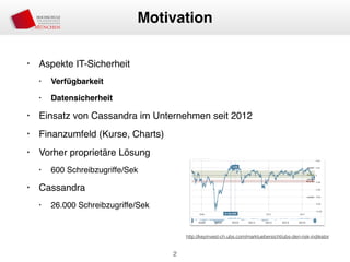 Das Dokument behandelt die Architektur und Leistungsmerkmale von Apache Cassandra, einem verteilten NoSQL-Datenbanksystem, das seit 2008 als Open Source verfügbar ist. Es werden Aspekte wie Daten-Replikation, Konsistenz, Sicherheit sowie die Skalierbarkeit des Systems in produktiven Umgebungen erläutert, insbesondere im Finanzsektor. Zudem werden verschiedene Strategien und technische Grundlagen wie das CAP-Theorem sowie Authentifizierungs- und Autorisierungsmechanismen besprochen.