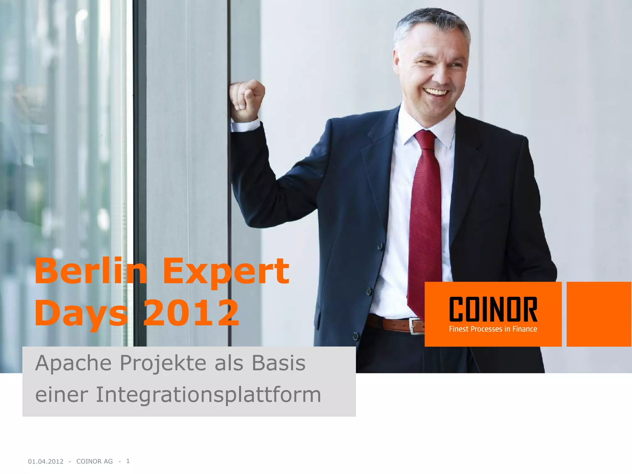 Die Coinor AG präsentiert auf den Berlin Expert Days 2012 ihre Expertise in der Unterstützung von Finanzdienstleistern durch die Implementierung von Apache-Projekten für eine zentrale Integrationsplattform. Der Fokus liegt auf dem Einsatz von Message-Orientierter Middleware und dem Apache Camel Framework zur Verbesserung von Geschäftsprozessen und Datenintegration. Zudem werden kommerzielle Ansätze zur Bündelung dieser Technologien für eine einfachere Nutzung in Unternehmen vorgestellt.