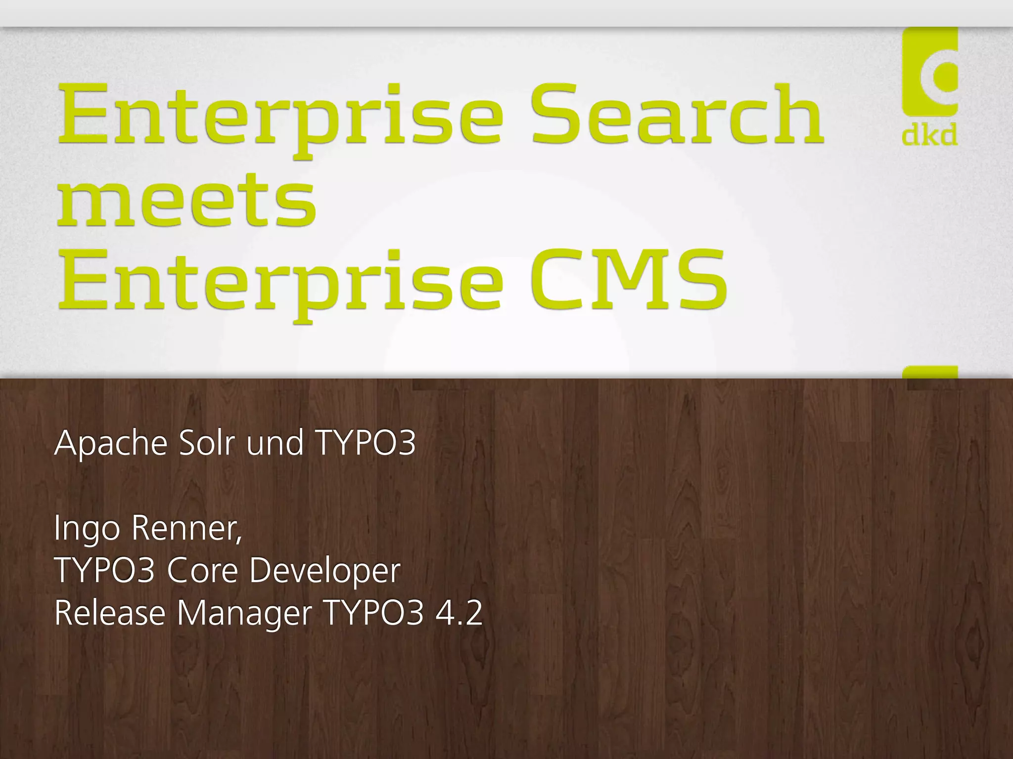 Das Dokument behandelt die Integration von Apache Solr, einem Open-Source-Enterprise-Search-Server, in das TYPO3-CMS. Es beschreibt die Entwicklungsgeschichte, technischen Herausforderungen und Lösungen zur Implementierung von Funktionen wie facettierter Suche, Dateiindexierung und mehrsprachigem Support. Zudem werden Community-Referenzen und Ressourcen zur Vertiefung des Themas aufgeführt.
