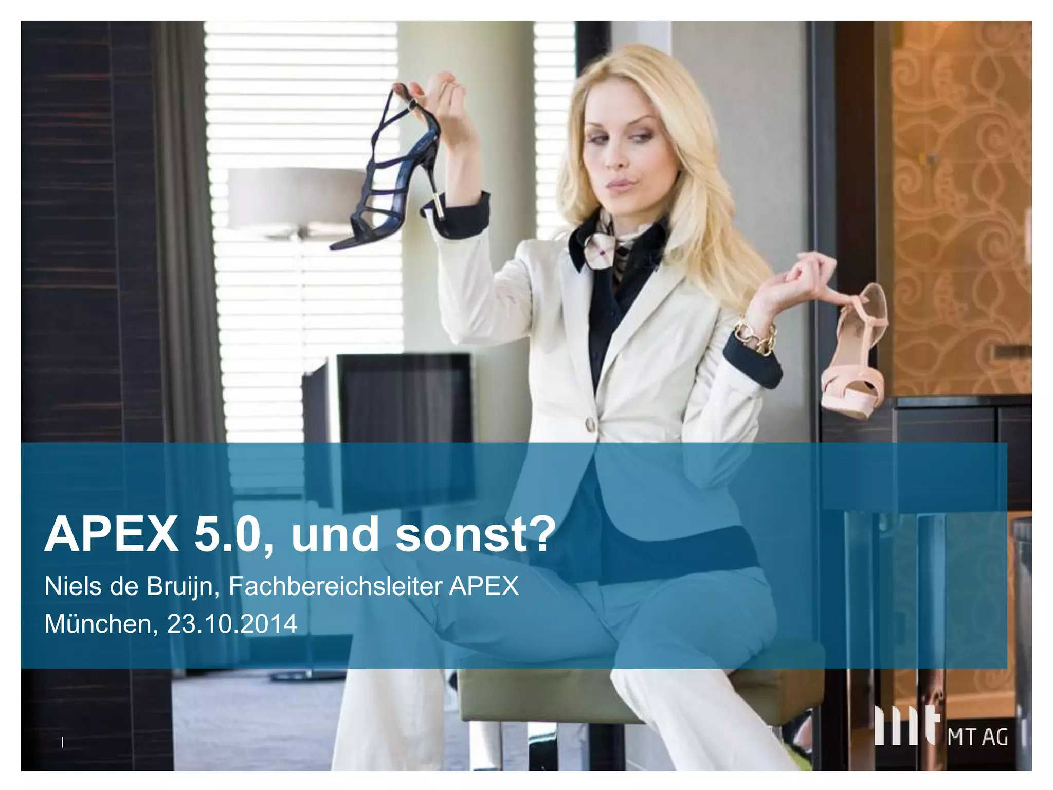 Das Dokument präsentiert die Funktionen und Möglichkeiten von Apex 5.0 und dessen Erweiterungen durch Technologien wie Node.js, Foex Plugins und Open Source Charting. Niels de Bruijn, Fachbereichsleiter bei MT AG, beschreibt zudem die Relevanz von Reporting-Tools und die Integration mit SAP sowie die Nutzung von Technologien zur App-Entwicklung wie PhoneGap. Die Präsentation bietet einen Überblick über neue Themen und Trends, die in der Apex-Entwicklung von Bedeutung sind.