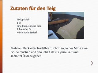 Das Dokument beschreibt die Zubereitung von Apfelstrudel, für den Mehl, Eier, Salz, Öl und Milch verwendet werden, sowie eine Füllung aus Äpfeln, Butter, Zucker, Sultaninen und Mandeln. Die Äpfel müssen geschält, geraspelt und mit weiteren Zutaten vermischt werden, bevor alles in einen ausgerollten Teig gewickelt wird. Der Strudel wird dann gebacken, bis er goldbraun ist, und zum Schluss mit Zucker bestreut.