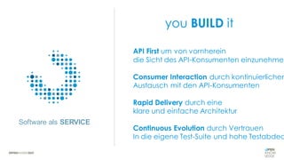 Das Dokument behandelt die Prinzipien von API-Design, Microarchitektur und Testing im Kontext von Software-as-a-Service. Es betont die Bedeutung einer consumer-zentrierten API-Entwicklung und kontinuierlicher Interaktion mit API-Konsumenten für schnelle Bereitstellung und Evolution von Software. Weiterhin werden Best Practices für Tests und Abwärtskompatibilität vorgestellt, um eine hohe Codequalität und effiziente Entwicklung zu gewährleisten.