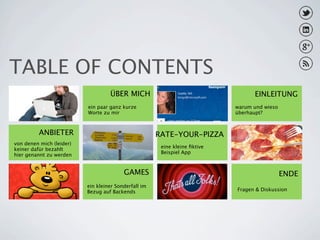 Das Dokument beschreibt die Notwendigkeit von Backends für mobile Apps, insbesondere zur Aktualisierung von Daten und für den Datenaustausch zwischen Nutzern. Es stellt verschiedene Anbieter von Backend-as-a-Service-Lösungen vor, wie stackmob.com, appcelerator.com und parse.com, und illustriert dies am Beispiel der fiktiven App 'rate-your-pizza'. Zudem wird auf die speziellen Anforderungen von Spiele-Backends hingewiesen.