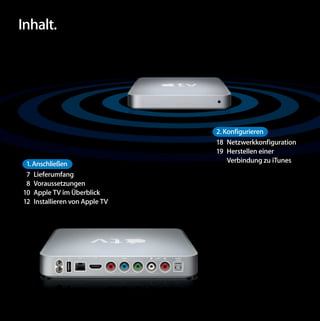 Dieses Handbuch für Apple TV bietet eine umfassende Anleitung zur Inbetriebnahme, einschließlich der erforderlichen Hardware- und Softwarevoraussetzungen sowie der Schritte zum Anschließen und Konfigurieren des Geräts. Es beschreibt die Verwendung der Apple Remote-Fernbedienung und die Verbindung zu iTunes für den Zugriff auf Inhalte. Außerdem werden Unterstützung und Problemlösungen behandelt, um die Benutzererfahrung zu optimieren.