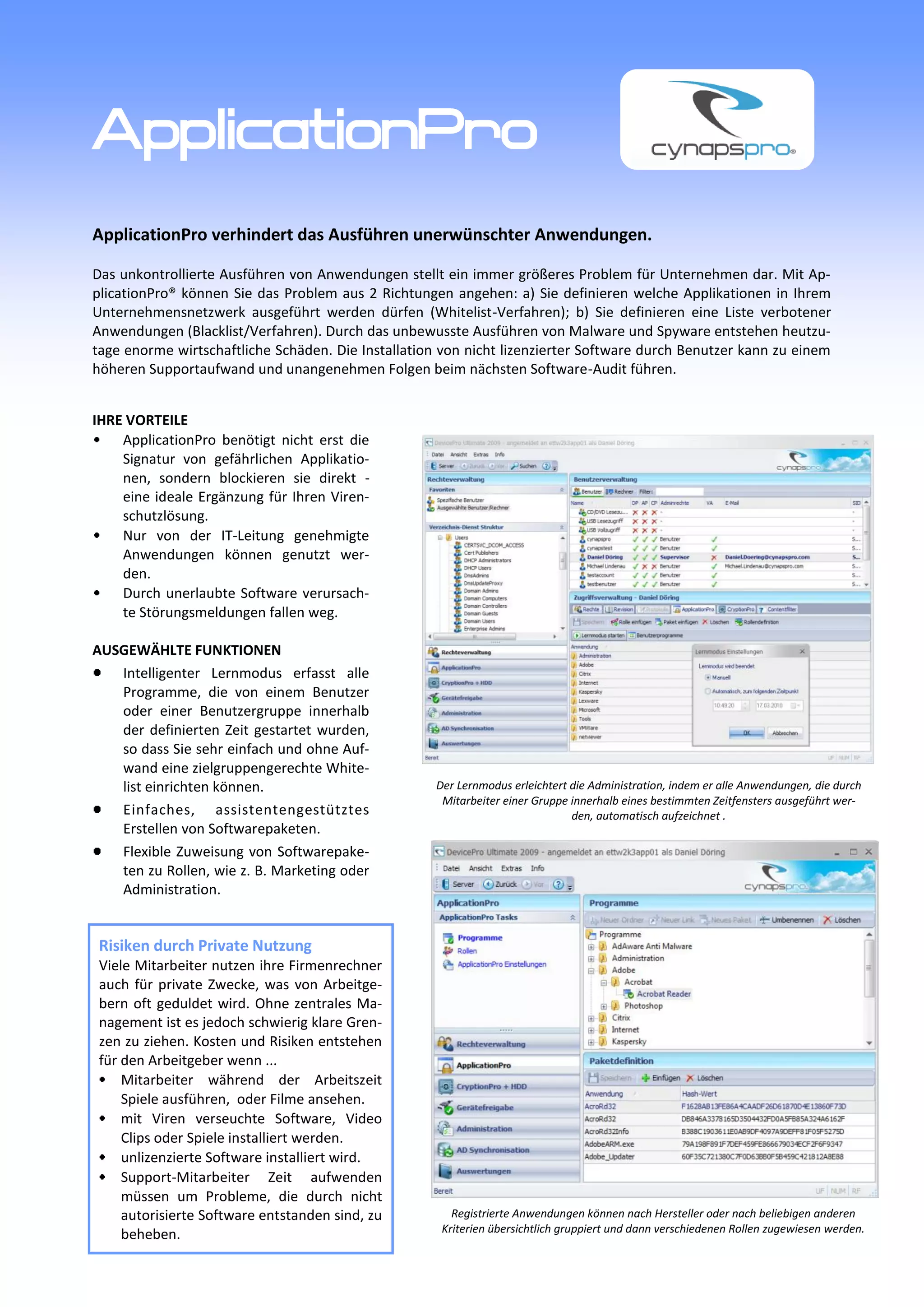 ApplicationPro verhindert das unkontrollierte Ausführen von Anwendungen im Unternehmensnetzwerk durch ein Whitelist- und Blacklist-Verfahren, um wirtschaftliche Schäden durch Malware und unlizenzierte Software zu vermeiden. Die Software ermöglicht intelligentes Management von Anwendungen, das Erfassen von Benutzeraktivitäten und die Zuweisung von Rollen, während CynapsPro Lösungen auch für Datenschutz und Datenverlustprävention sorgen. Die Implementierung ist benutzerfreundlich und kann mit bestehenden Drittanwendungen integriert werden.