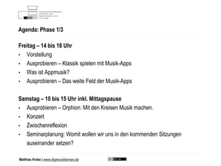 Das Dokument beschreibt ein Proseminar über appmusik, das darauf abzielt, verschiedene Nutzungskonzepte von Musik-Apps für den modernen Musikunterricht zu erkunden. Die Teilnehmer lernen, wie man mit diesen Apps Musik macht, reflektieren ihre Erfahrungen und diskutieren die Aneignungsprozesse, die dabei eine Rolle spielen. Es werden Methoden erörtert, um Schüler in den kreativen Umgang mit digitalen Musikinstrumenten einzuführen.