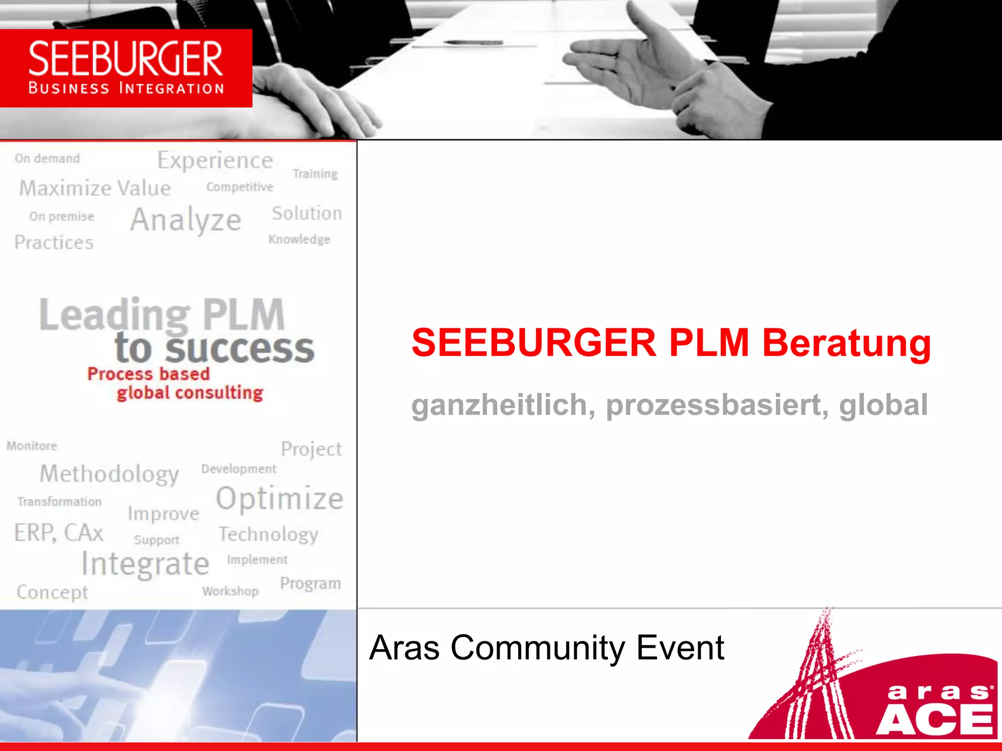 Das Dokument präsentiert die Seeburger AG als globalen Experten für Business Integration mit einer umfassenden Produktpalette, einschließlich der Seeburger Business Integration Suite und PLM-Beratung für Aras. Es beschreibt die Methodik und Werkzeuge, die bei der PLM-Implementierung verwendet werden, sowie geplante Erweiterungen der Seeburger-Lösungen. Zudem enthält das Dokument Kontaktinformationen und rechtliche Hinweise zu den angebotenen Dienstleistungen.