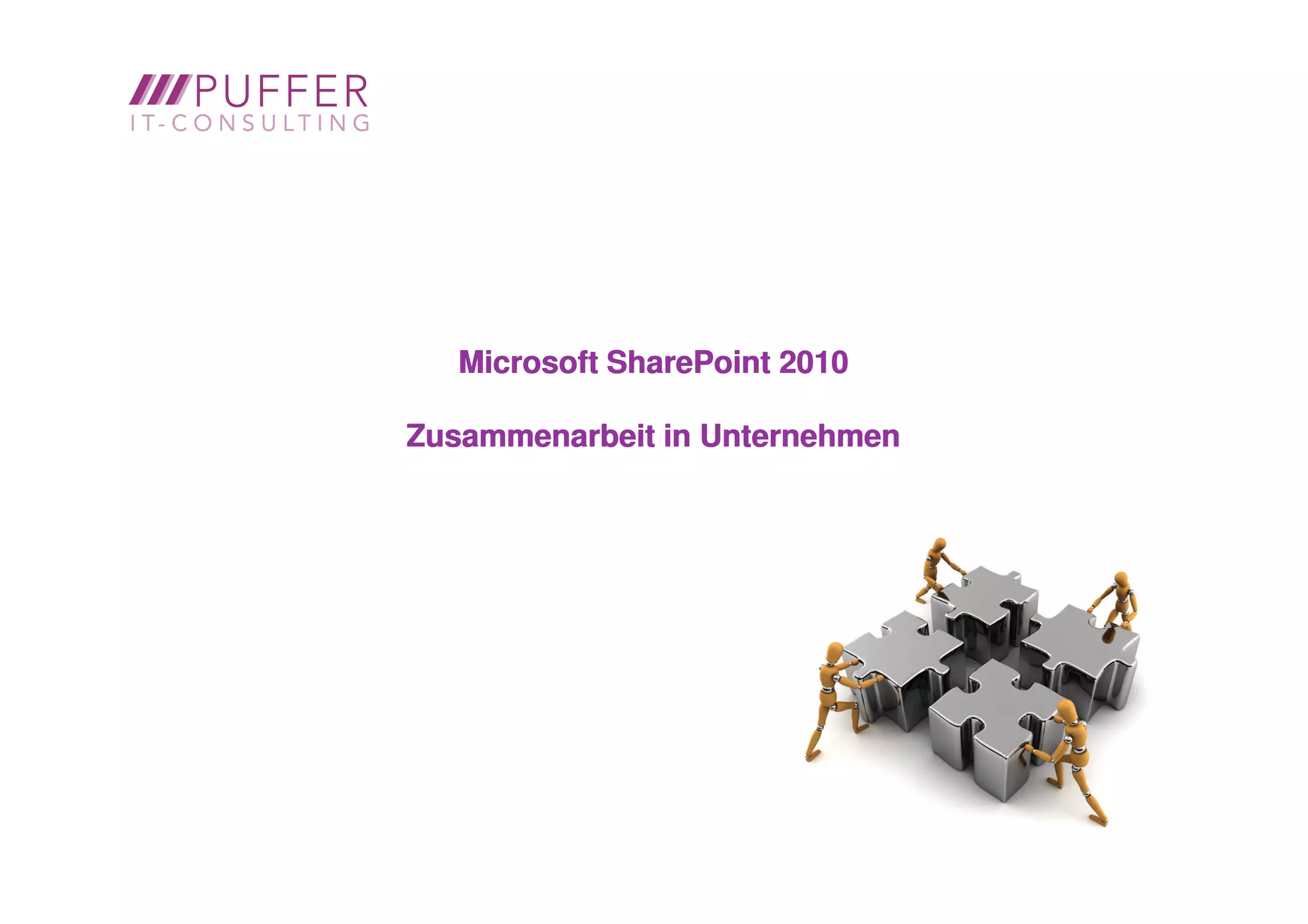 Das Dokument beschreibt Microsoft SharePoint 2010 als eine Plattform für die Zusammenarbeit in Unternehmen, die verschiedene IT-Lösungen wie Kundenbeziehungsmanagement und Dokumentenmanagement integriert. Es hebt die Vorteile von SharePoint hervor, einschließlich globalem Zugriff, datengestütztem Management und Unterstützung bei der Automatisierung von Geschäftsprozessen. Zudem betont es die Anpassungsfähigkeit und Integration mit anderen Microsoft-Tools zur Effizienzsteigerung in der Unternehmensorganisation.