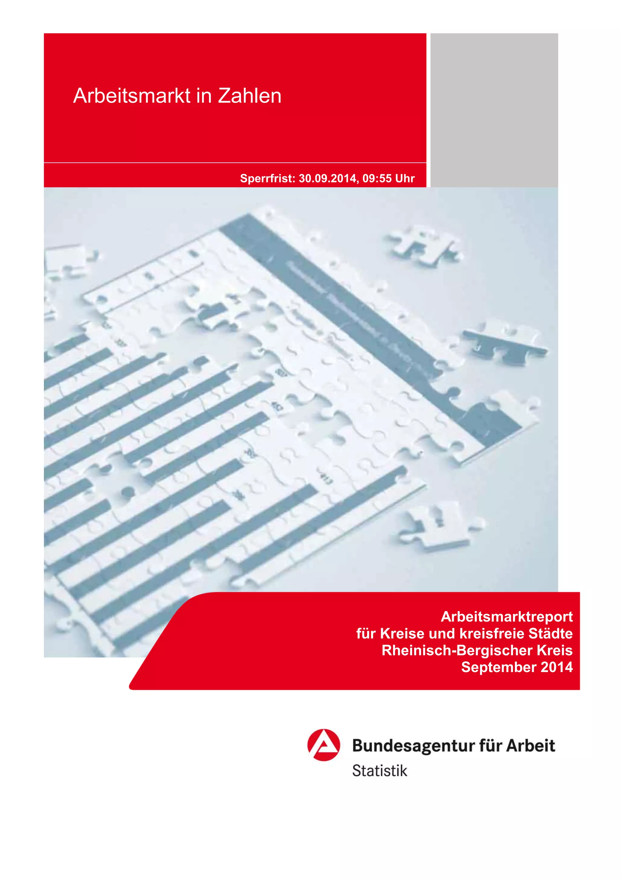 Der Arbeitsmarktreport für den Rheinisch-Bergischen Kreis im September 2014 präsentiert wichtige statistische Daten zur Arbeitsmarktsituation, einschließlich der Anzahl von Arbeitsuchenden und Arbeitslosen. Im Vergleich zum Vorjahr gab es einen Rückgang der Arbeitslosen um 4,2%, während die Zahl der Arbeitsuchenden um 2,5% fiel. Der Bericht enthält auch Informationen zur Anstellung, zur Sozialversicherungspflicht und zu unterbeschäftigten Personen in der Region.