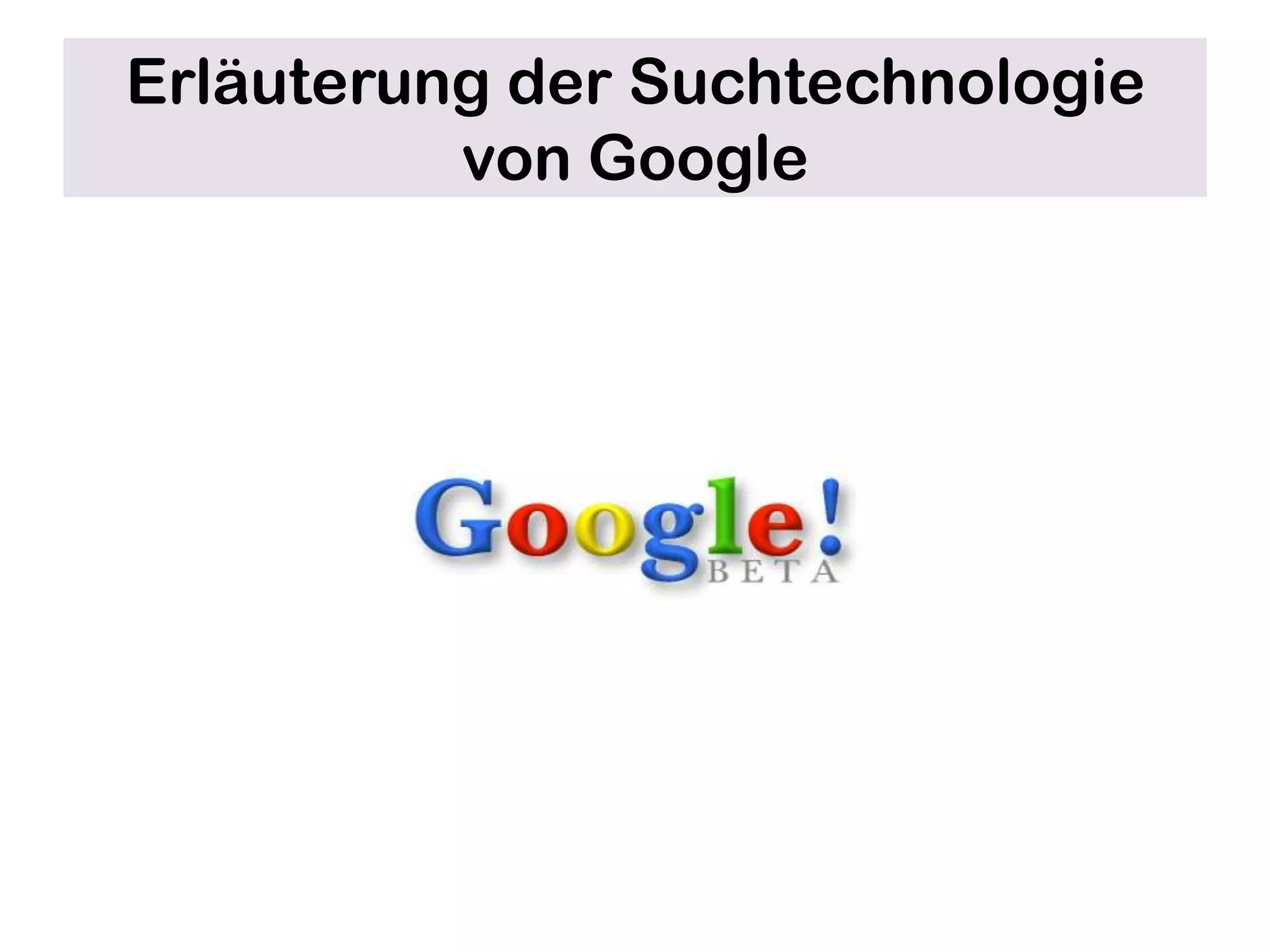 Das Dokument beschreibt die Suchtechnologie von Google in vier Schritten: Crawling, Indexing, Ranking und Displaying. Crawling umfasst das Finden neuer Seiten durch Links und die Übermittlung an den Index, während Indexing diese Seiten indiziert. Ranking ordnet die Seiten basierend auf über 200 Faktoren wie dem PageRank, und Displaying präsentiert die Ergebnisse benutzerfreundlich.