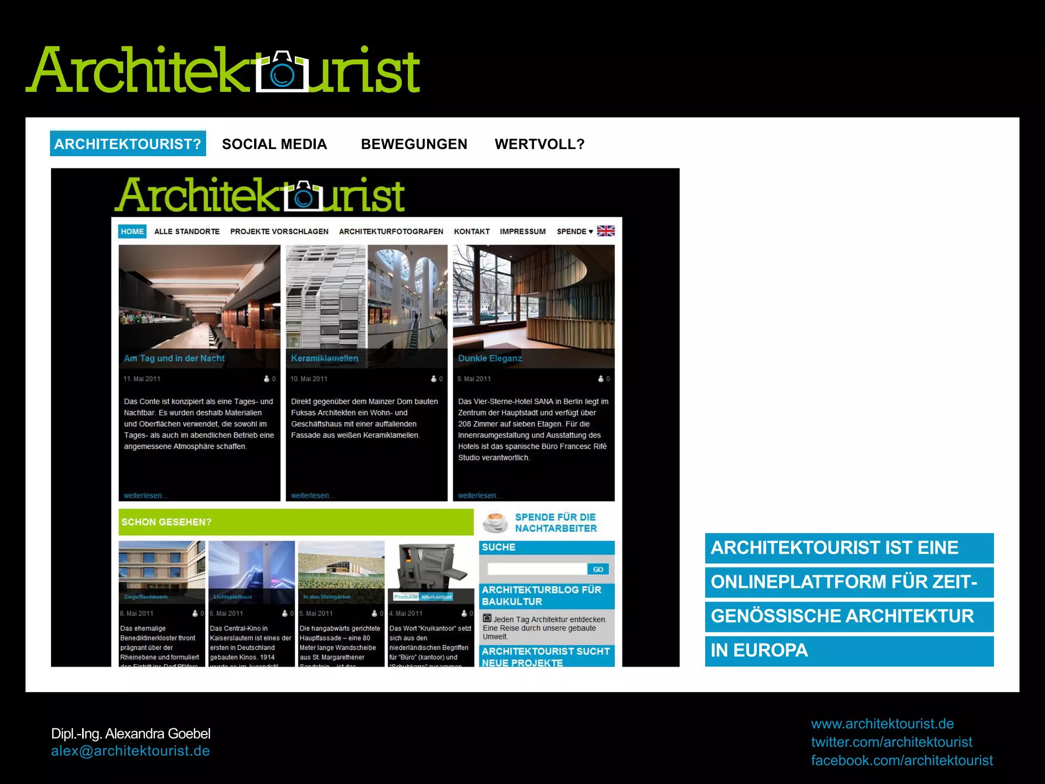 Architektourist ist eine Onlineplattform, die sich seit dem 1. März 2010 der zeitgenössischen Architektur in Europa widmet und sowohl Architekturblogs als auch Architekturfotografie präsentiert. Die Plattform hat über 353 Projekte online und engagiert sich für die Entdeckung unbekannter Architekten, wobei sie auch über soziale Medien wie Facebook und Twitter verbreitet wird. Ziel ist es, die Öffentlichkeit für Architektur zu begeistern und tägliche Inspiration zu bieten.