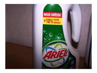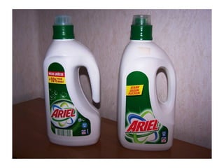 Das Dokument vergleicht zwei Flaschen Ariel Color und weist auf die Unterschiede im Design und die angegebenen Wäscheanzahlen hin. Die 'neue' Flasche behauptet, 10% mehr Inhalt zu haben, ermöglicht aber nur 18+2 Wäschen, was die Behauptung der Ergiebigkeit in Frage stellt. Der Autor ist verärgert und fühlt sich durch irreführende Angaben betrogen.
