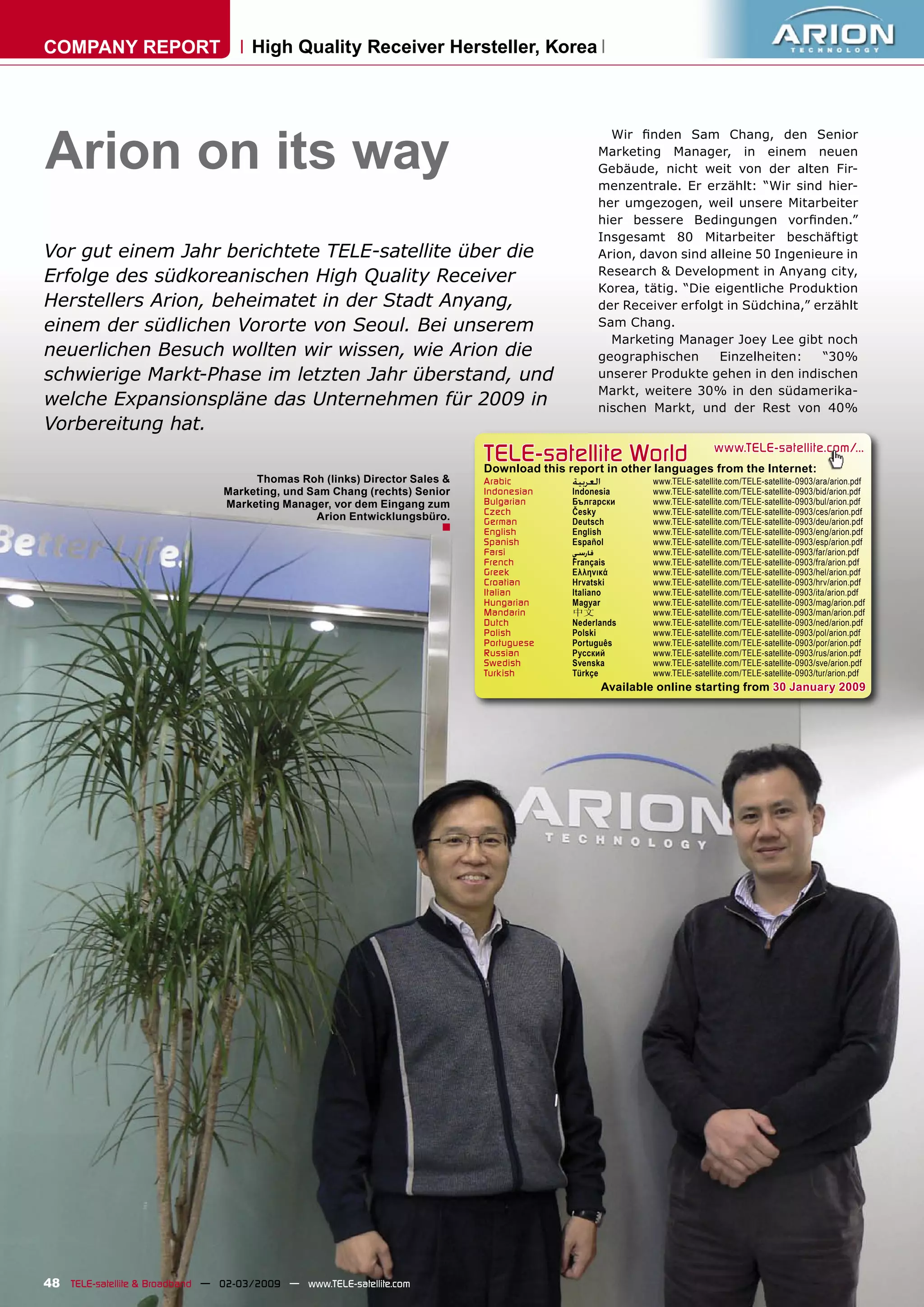 Arion, ein südkoreanischer Hersteller von hochwertigen Receivern, hat seine Büros nach Anyang verlegt, um bessere Arbeitsbedingungen für die 80 Mitarbeiter zu bieten. Das Unternehmen plant 2009 eine Expansion in Nischenmärkte, während es weiterhin auf den europäischen Markt fokussiert ist, insbesondere im HD-Segment. Neue Produkte, einschließlich HDTV-Receiver mit PVR-Funktionen, sind für die kommenden Quartale in Planung.