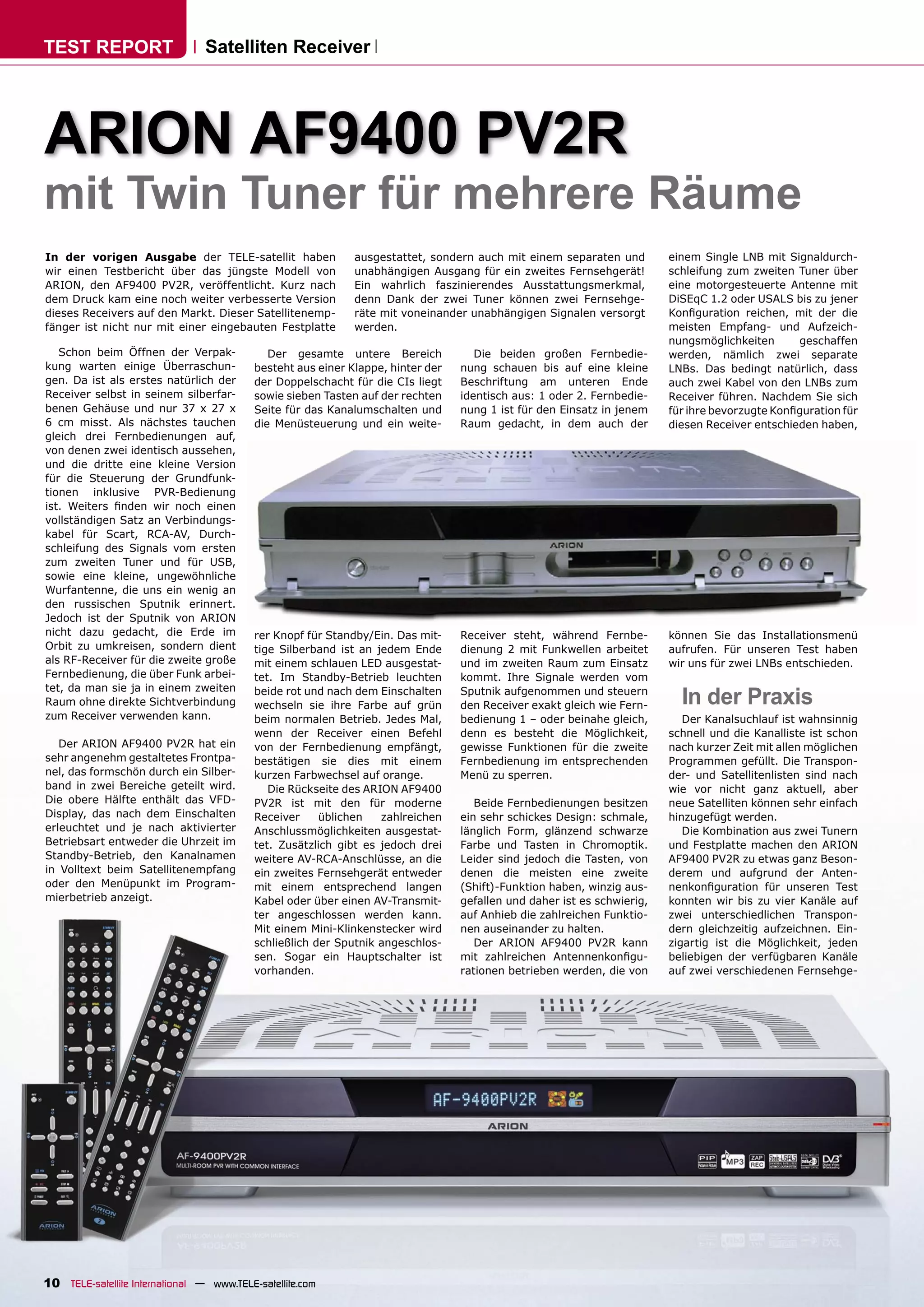 Der Testbericht beschreibt den Satellitenreceiver Arion AF9400 PV2R mit Twin Tuner und PVR-Funktionen, der die gleichzeitige Nutzung in mehreren Räumen ermöglicht. Er bietet eine Vielzahl an Empfangs- und Aufzeichnungsoptionen, einschließlich einer motorgesteuerten Antenne und der Fähigkeit, mehrere Kanäle gleichzeitig aufzuzeichnen. Trotz der positiven Aspekte, wie zwei CI-Einschübe und einer großzügigen Festplatte, wird die Bedienung durch kleine Fernbedienungstasten als anspruchsvoll beschrieben.