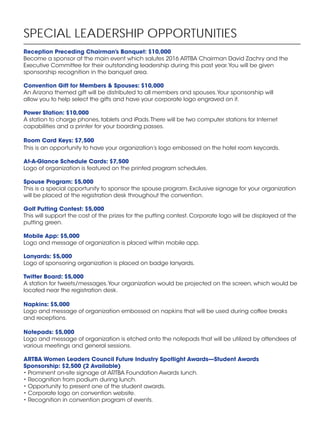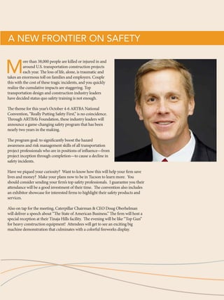 This document provides information about the 2016 ARTBA National Convention being held from October 4-6 at the JW Marriott Tucson Starr Pass Resort & Spa in Tucson, Arizona. The convention will focus on putting safety first and will feature presentations on new safety certification programs and discussions on transportation policy and business topics. The document outlines the schedule of events, list of sponsors, and information about the host hotel and exhibitors.