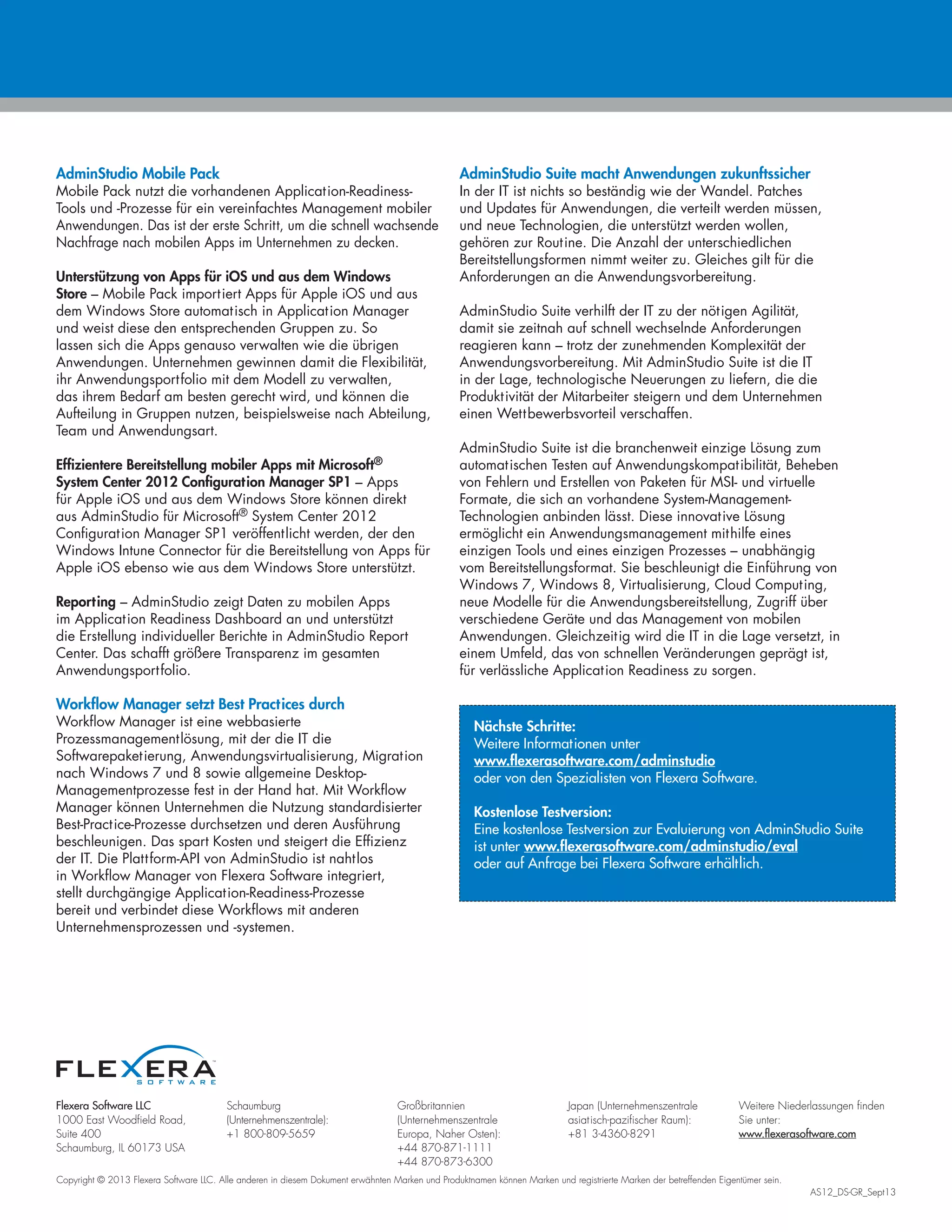 Die AdminStudio Suite von Flexera Software ist eine umfassende Lösung für die Anwendungsvirtualisierung, das Management mobiler Apps und die Erstellung von Anwendungsinstallationen. Sie ermöglicht die effiziente Automatisierung der Anwendungsvorbereitung, Beschleunigung der Migration auf Windows 7 und 8 sowie die Vereinfachung von Desktop-Managementprozessen. Die Suite bietet Tools für das Testen, die Fehlerbehebung und das Reporting, wodurch Unternehmen ihre Anwendungsportfolios effektiv verwalten und schnell auf Veränderungen reagieren können.