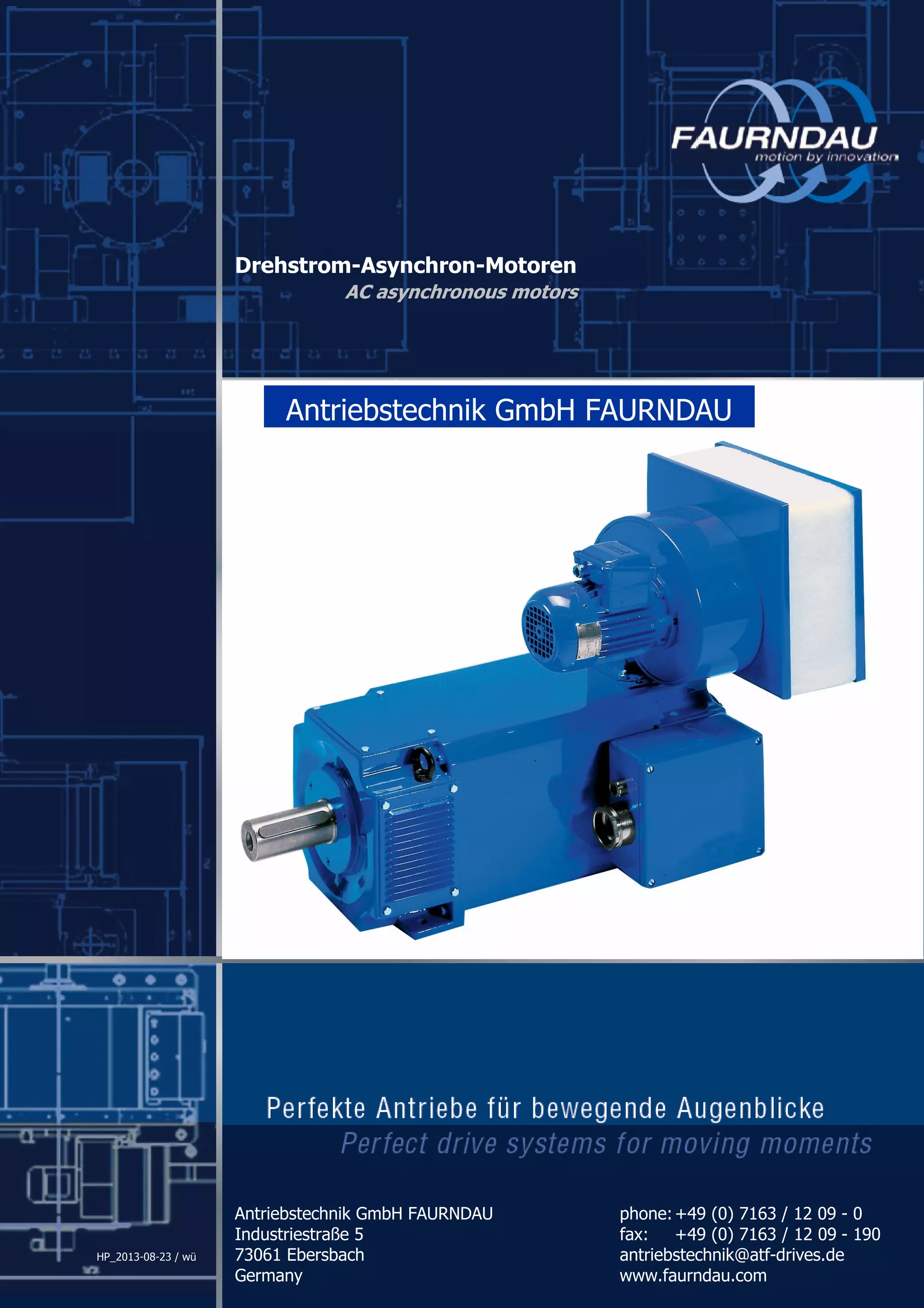 Das Dokument beschreibt die technischen Spezifikationen und Merkmale von Drehstrom-Asynchronmotoren der Firma Antriebstechnik GmbH Faurndau. Es enthält Informationen zu Typcodes, Bauformen, Kühlarten, Schutzarten, Abmessungen sowie spezifischen Leistungsdaten unterschiedlicher Modelle. Die Motoren sind für verschiedene Anwendungen und Anforderungen konzipiert, mit Anpassungsmöglichkeiten hinsichtlich Leistung und Drehzahl.