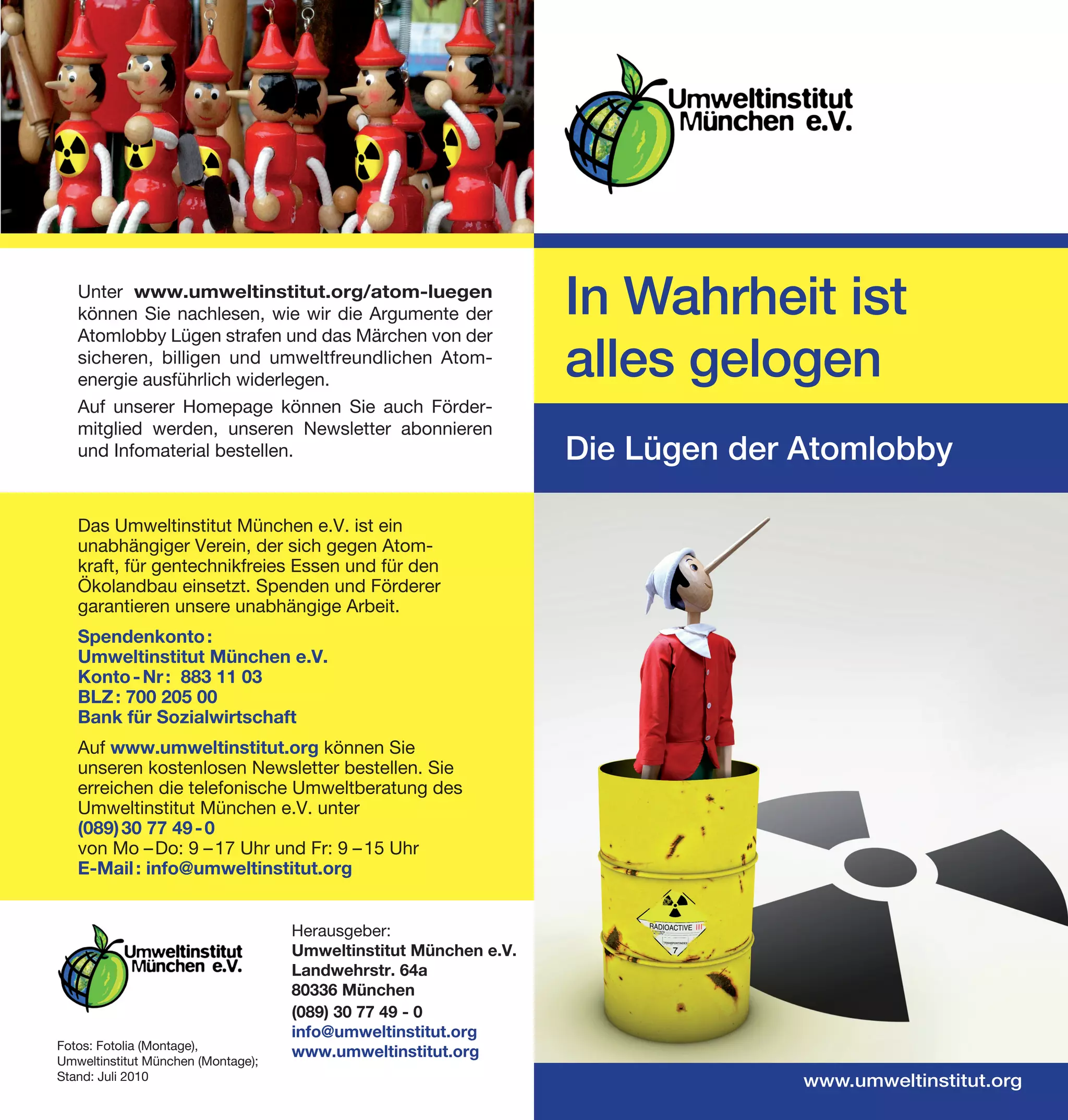 Das Umweltinstitut München e.V. widmet sich der Widerlegung der Argumente der Atomlobby und betont die Gefahren und Fehlinformationen rund um die Atomenergie. Es setzt sich für erneuerbare Energien, gentechnikfreies Essen und ökologischen Landbau ein und bietet Informationen sowie Unterstützungsoptions auf seiner Website an. Die Gefahren der Atomkraft, wie ungesicherter Atommüll und mögliche Gesundheitsrisiken, werden hervorgehoben, während die Zukunft auf erneuerbare Energien ausgerichtet sein sollte.