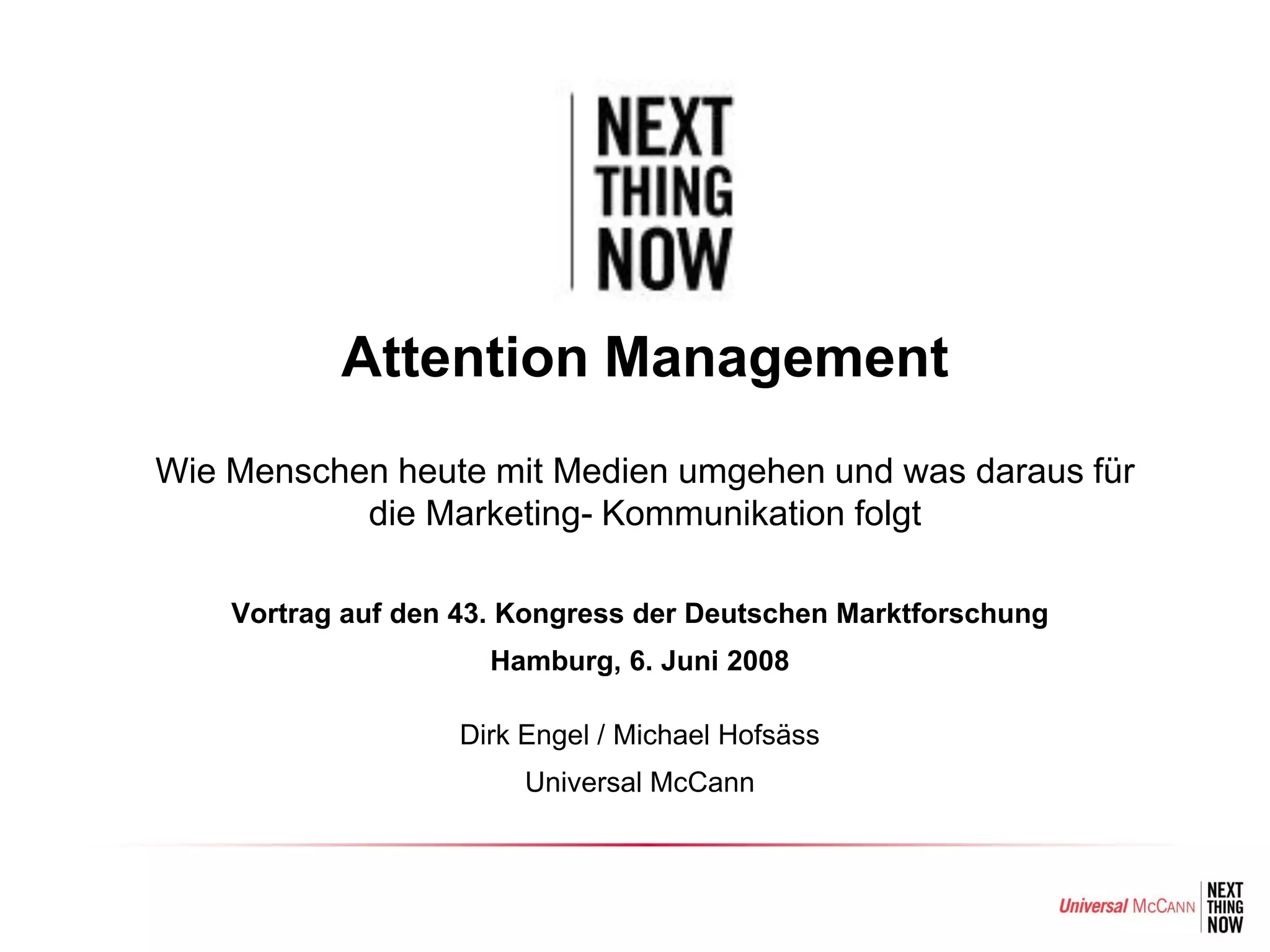 Der Vortrag thematisiert, wie Menschen mit der zunehmenden Medienvielfalt umgehen und welche Konsequenzen dies für das Marketing hat. Es wird betont, dass die Aufmerksamkeit der Nutzer entscheidend für die Wahrnehmung von Werbung ist und dass das Verständnis der psychologischen Mechanismen hinter der Mediennutzung notwendig ist, um zukünftige Entwicklungen vorherzusagen. Die Präsentation basiert auf umfassenden Daten, die durch eine wöchentliche Tagebuchstudie erhoben wurden, und zeigt den sich verändernden Anteil der Mediennutzung, insbesondere den Übergang von Fernsehen zu Internet.