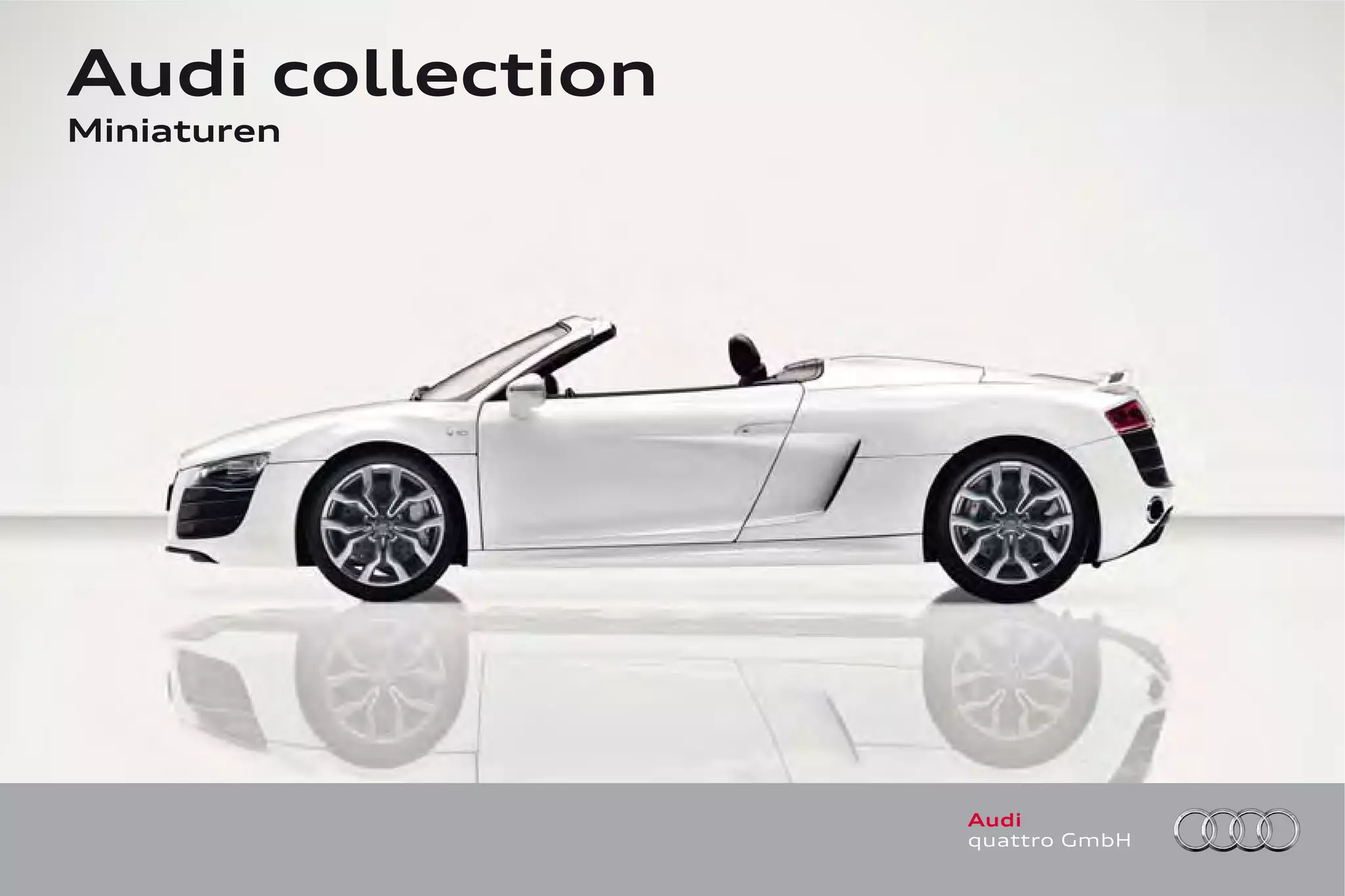 Bestellungen Alle hier gezeigten Artikel können Sie bei unseren Audi Partnern oder in den Audi Foren in Ingolstadt und Neckarsulm kaufen. Darüber hinaus können Sie die Artikel der Audi collec- tion auch bequem von zu Hause aus bestellen. Bestellungen per Fax +49 (0) 180/500 31 56 (0,14 Euro/Min. aus dem dt. Festnetz) oder telefonisch unter +49 (0) 180/500 31 55 (0,14 Euro/Min. bei Anrufen aus dem dt. Fest- netz. Die Preise können bei Anrufen aus den Mobilfunknetzen abweichen.) oder per E-Mail lifestyle@audi-shop.de oder im Internet www.audi.de/audishop Alle Angebote, solange der Vorrat reicht. Für Satz- und Druckfehler übernehmen wir keine Haftung. Alle Angaben basieren auf den Merkmalen des deutschen Marktes. Änderun- Audi Spielzeugmodell gen vorbehalten. Diese umfangreiche Sammlung erlaubt spannen- Baujahr: seit 2004 Die Abbildungen der Fahrzeugmodelle de Einblicke in die Welt der Audi Miniaturen. Zehn Maßstab: 1:64 entsprechen nicht unbedingt der Original- verschiedene Modelle aus Zinkdruckguss – vom Hersteller: Kyosho größe. Die Detailgenauigkeit kann bei den Audi A3 Sportback bis zum Audi R8 – sind in jeweils unterschiedlichen Maßstäben abweichen. zwei Farbvarianten erhältlich. Die in Sammelboxen 320.07.008.10 Einzelbox Technische und Ausstattungsänderungen verpackten Spielzeugmodelle sind detailreich 4,90 Euro vorbehalten. und hochwertig gefertigt und werden auf einem Kunststoff sockel präsentiert. Natürlich können Sie 320.07.008.20 20er-Display die Minimodelle auch einzeln bestellen – welches 98,00 Euro von den 20 dann zu Ihnen nach Hause kommt, ist eine Überraschung. Für große und kleine Kinder ab drei Jahren. 107